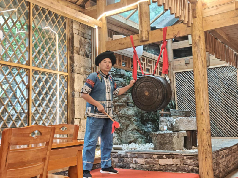 在中华民族大家庭中,布依族有着悠久的历史和灿烂的文化。在村落的小道旁,有一家布依族小餐馆,身着布依族传统服饰的杨维正向用餐的外地游客们进行着“铜鼓十二调”表演。“我们的铜鼓十二调是2006年第一批国家级非物质文化遗产。‘十二’在我们文化里象征‘十二重天’,所以统称铜鼓十二调。”杨维老师向实践队员介绍道。为了让铜鼓的声音传得更远,他不仅自己亲授学生,还在村里开设研学课堂接待外省的学生,同时,为了让这份传统文化“活”起来,他还和队员一起成立了“铜鼓神韵乐队”,让语言与旋律共舞,使传统在吟唱中延续。文化在这里不仅是传承,更是一种信仰,深植于土地与血脉之间,构成高荡村独特的精神图谱。