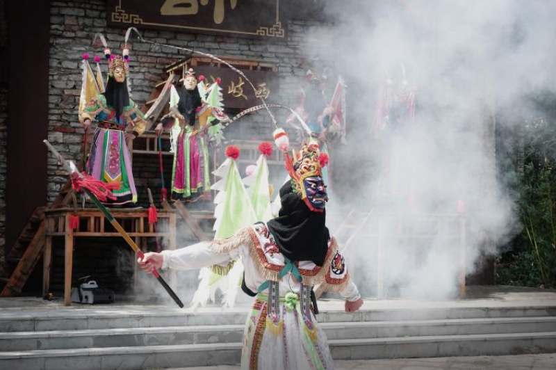 在天龙屯堡小学堂,一场精彩的地戏表演如期上演。表演者头戴色彩鲜明的面具,身着传统服饰,以高亢激昂的唱腔演绎着“殷郊伐西岐”故事,动作刚劲有力,配合锣鼓声展现出独特的艺术张力。