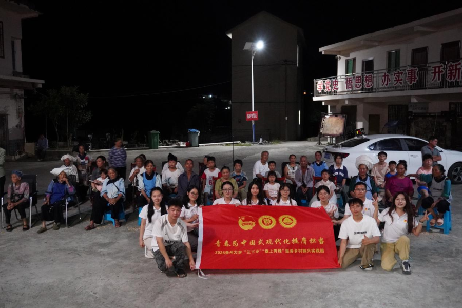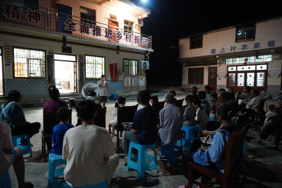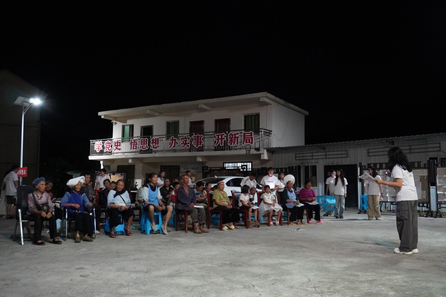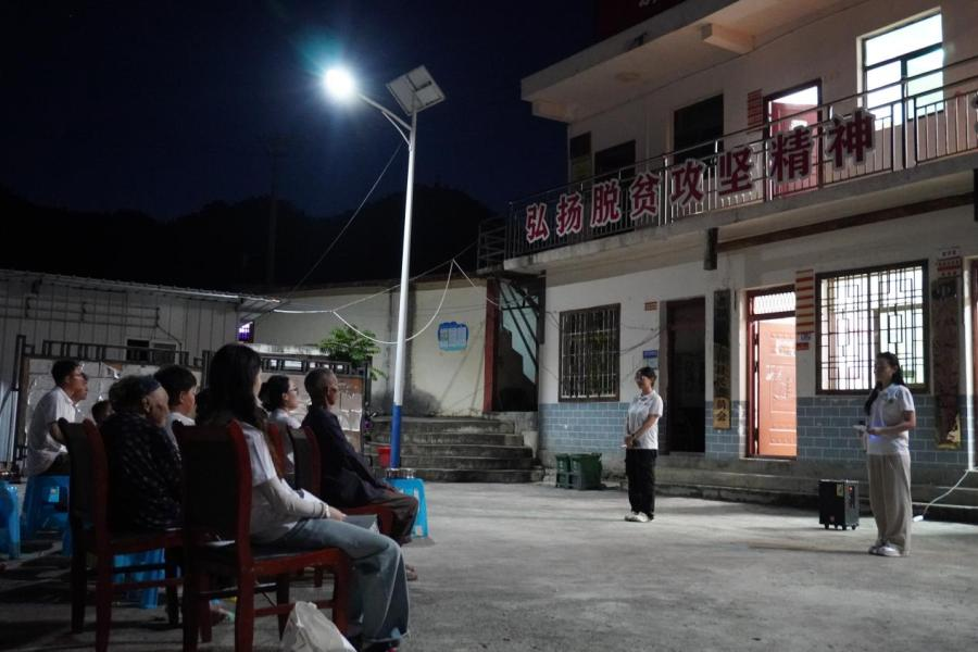 团委网站讯(记者 彭沛嘉 朱娟 报道 摄影)7月16日,我校林学院“旗上青绿”服务乡村振兴实践团在贞丰县者相镇旗上村党群务中心举办了一场主题鲜明、内容丰富的坝坝会。他们用群众喜闻乐见的方式,将文艺表演与防汛减灾、防范诈骗知识普及紧密结合,把安全知识送到村民家门口,既“接地气”又“有干货”,为宁静的乡村夜晚注入活力与暖意。此次活动吸引了超40名村民参与。