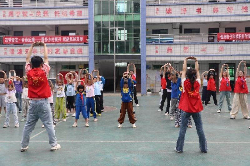 在贵安新区湖潮乡磊庄村机场小学,实践队与贵州电子科技职业学院“青春逐梦”实践队携手,共同开展苗医药文化宣传活动。通过八段锦教学、“七步洗手法”专题活动、艾草锤制作体验等生动有趣的活动形式,两校青年带领小学生们近距离感受苗医药文化的魅力。