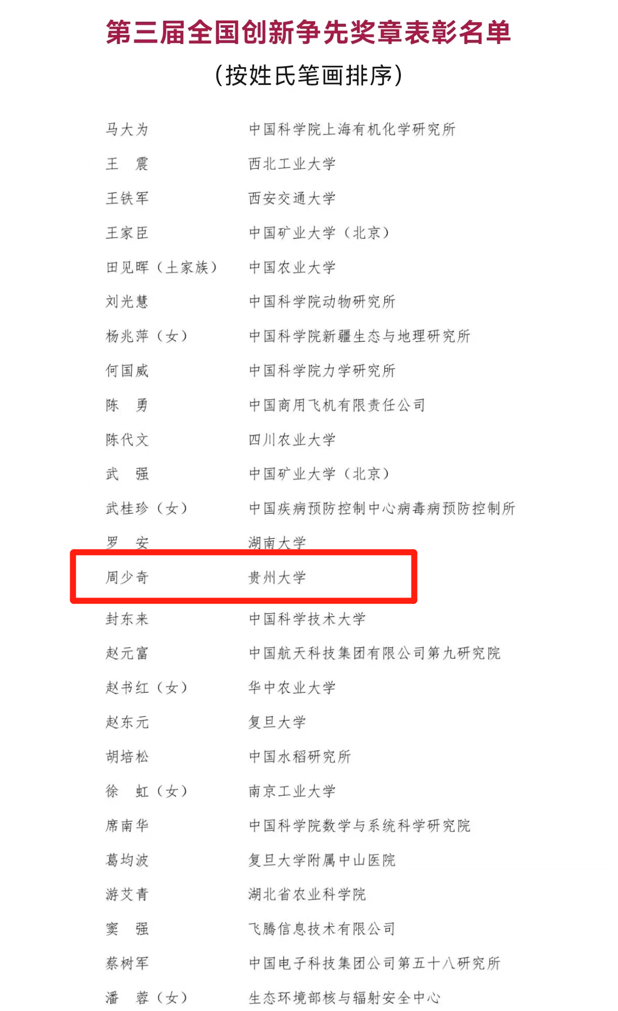 近日,为进一步表彰在面向世界科技前沿、面向经济主战场、面向国家重大需求、面向人民生命健康和社会服务等相关科技创新领域作出突出贡献的个人和集体,人力资源和社会保障部、中国科协、科技部、国务院国资委决定授予7个团队第三届全国创新争先奖牌,授予26名同志第三届全国创新争先奖章,授予251名同志第三届全国创新争先奖状。我校副校长周少奇被授予“第三届全国创新争先奖章”。