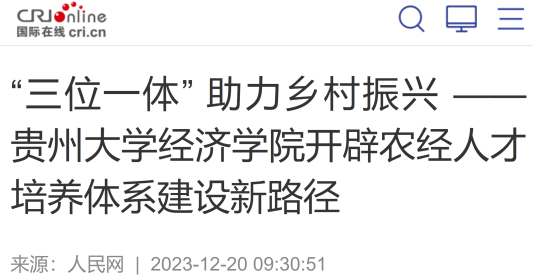 农为邦本,本固邦宁,乡村振兴靠人才,人才培养靠教育。贵州大学经济学院将继续以人才培养为重点,更加深入地开展乡村经济和社会发展的研究,将学院建设成为“扎根贵州、立足国内、面向世界”的重要基地,发挥人才培养、科学研究和社会服务等方面的优势,为乡村振兴提供全面的人才和智力支持,为推动我国乡村经济的发展作出更大的贡献。