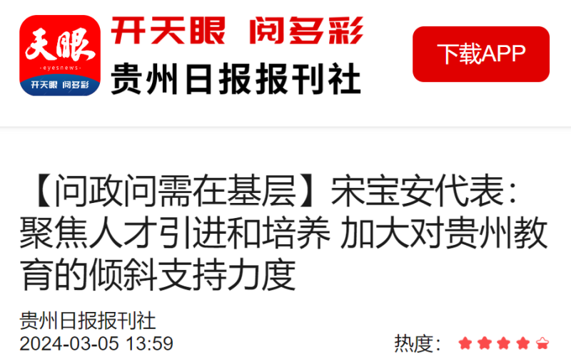对此,宋宝安建议:聚焦人才引进和培养两个重点,尊重用好现有人才、大力引进急需人才,加大对贵州教育的倾斜支持力度。