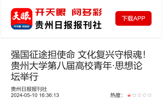 5月9日,以“强国征途担使命,文化复兴守根魂”为主题的第八届高校青年·思想论坛在贵州大学东校区中国文化书院勉学堂举行。论坛旨在重温习近平总书记2011年5月9日视察贵州大学时发表的重要讲话精神,鼓励青年学子学深悟透习近平文化思想,推动高校师生对习近平文化思想的研究阐释。