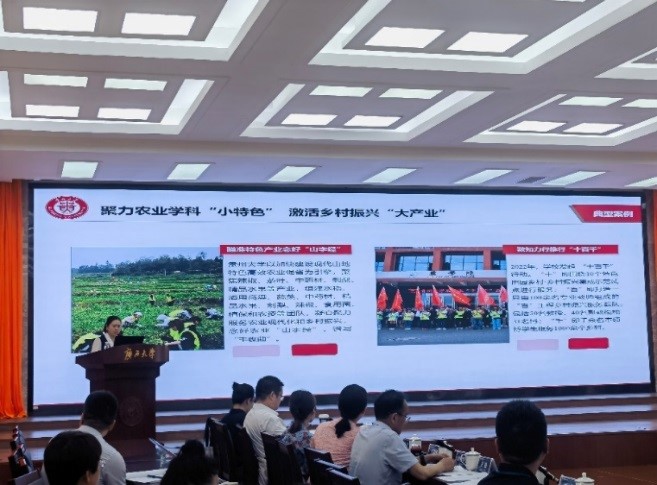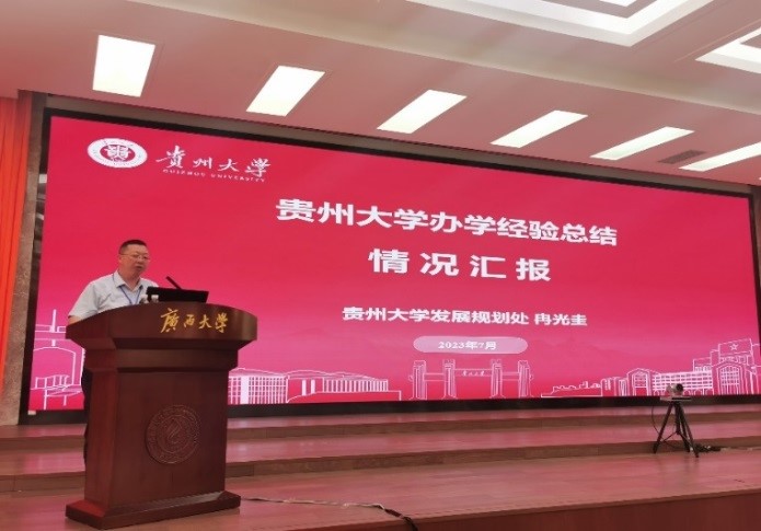 发展规划处负责同志参加了“部省合建高校服务地方经济社会发展研究”和“部省合建高校发展特色与办学经验研究”两个部省合建专项课题研讨。根据会议议程,发展规划处处长冉光圭于2023年7月3日上午、副处长张慧于2023年7月4日上午分别作了题为《贵州大学特色办学经验总结》和《贵州大学服务地方典型案例》的汇报,介绍了贵州大学既聚焦国家和地区重大战略需求,又倾力支持地方经济社会发展,积极探索具有西部特色的高等教育现代化特色发展之路,同时分享了课题研究进展及下一步工作计划等情况。