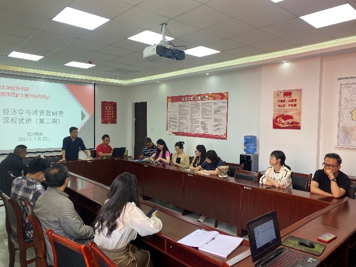 为提升教师教学能力和水平,第二期经济学与国际贸易教研室课程试讲活动成功举办。此次试讲活动涵盖国际经济学、国际贸易理论与实务、国际商务、经济思想史、劳动经济学、福利经济学六门课程,旨在通过专业课程教学设计、教学试讲、教学方式方法研讨,推动教学方法改进创新和教学效果提升。