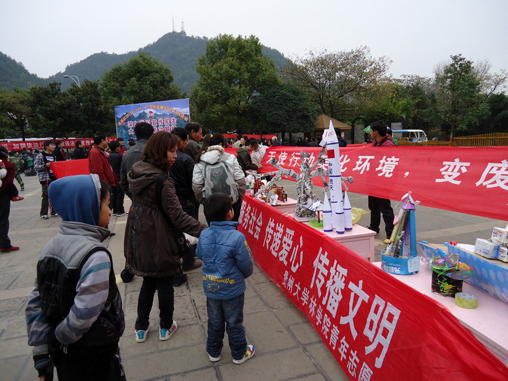 通讯员 (周朝龙 报道)12月4日,贵州大学林学院青年志愿者协会在花溪公园门口举行“天使行动,美化环境,变废为宝,创建和谐”主题为“变废为宝”废品模型创作成果展和绿色生活签名活动。