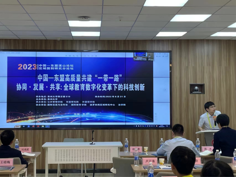 2023年8月31日,由贵州大学公共管理学院、东盟研究院、外国语学院共同承办的2023 中国一东盟溪山论坛区域国别研究分论坛在贵州大学雅正楼519举行。本次论坛以“中国一东盟高质量共建‘一带一路’协同·发展·共享:全球教育数字化变革下的科技创新”为主题,特邀浙江师范大学非洲研究院院长刘鸿武教授、北京语言大学国别和区域研究院院长罗林教授、广西民族大学国际学部主任、外国语学院院长张旭教授、腾讯发展研究中心高级研究员赵罗希作主旨演讲。论坛第二阶段由外国语学院院长周杰主持,英语语言文学硕士点主任朱晓烽副教授作题为“东南亚华人译者群体与中国网络文学的海外传播”的主题发言。我院23名硕士研究生在论坛第三阶段作小组发言。
