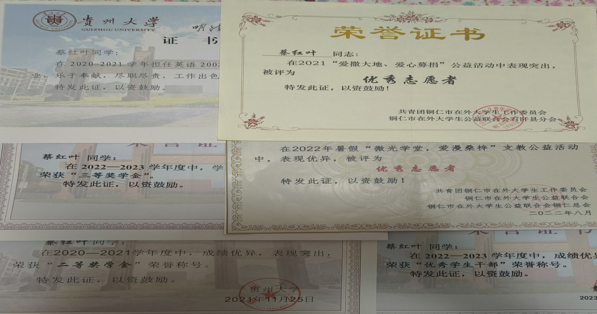 蔡红叶,就读于贵州大学外国语学院英语专业。已获得英语专四,专八,大学英语四、六级等多项证书。在学习上,勤奋刻苦,多次获得学校学业奖学金并于2022年获得国家励志奖学金。在工作上,勤勤恳恳,担任学习委员期间为班级学习事务尽职尽责,于2023年获得校级优秀学生干部荣誉称号。在实践中,积极参加校内外志愿支教等公益活动,多次获得优秀志愿者称号。在日常生活中与人为善,爱好阅读,热衷于挑战自我!