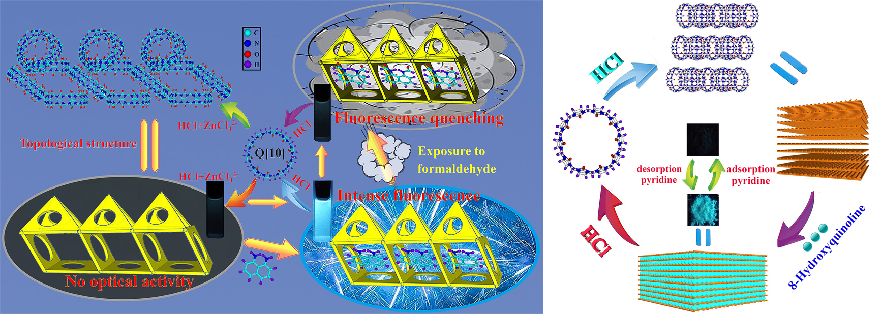 同时,课题组在此基础上,利用十元瓜环在盐酸介质条件下形成的一种层状超分子自组装体,将其负载化合物8-羟基喹啉,荧光强度得到大幅度提升,制成荧光材料,然后将该荧光材料去吸附响应甲醛、吡啶等13种有害气体,实验结果发现,该荧光材料仅能识别吡啶气体,吡啶气体能在2h内将该荧光材料的荧光强度削弱16倍,其光学性质发生由蓝色荧光→无荧光的强烈转变,并且经过真空处理,吡啶气体可完全释放出来,成为一种良好的吡啶气体识别、储备材料。因此,该荧光材料可作为检测吡啶的一种良好的光学传感器和吸附材料,循环使用,节约能源,降低成本。
