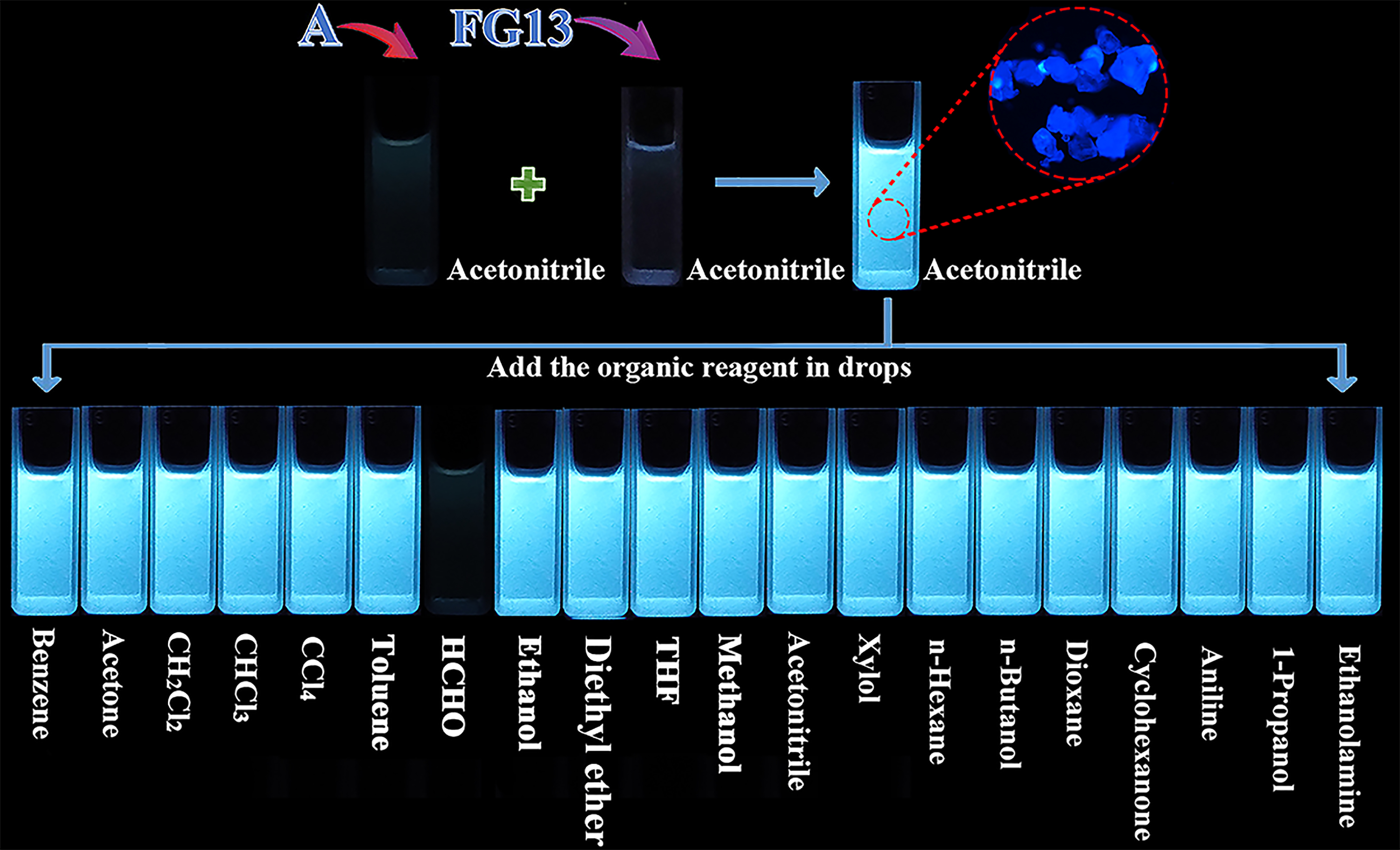 最近,我校大环及超分子重点实验室2017级硕士生刘明(通讯作者:肖昕教授,陶朱教授),对大环化合物传感器领域进行了大量深入的研究,利用十元瓜环在盐酸介质和Zn2+的诱导下形成的一种多孔超分子自组装体,将其负载化合物18-二氨基萘,光学性质得到大大提升,然后将其分别置于含甲醛、吡啶、乙醇、呋喃等13种有毒有害气体的密闭空间,实验结果表明其只能对甲醛气体产生特殊响应,荧光强度削弱19.5倍,产生强烈的视觉效应(紫色荧光→无荧光),其最低检测限可达到0.09 mg/m3,可作为检测甲醛的一种良好的光学传感器,并且将其置于HCl介质中,甲醛气体可以迅速释放出来,可以作为吸附甲醛的一种储气材料,高效循环利用。