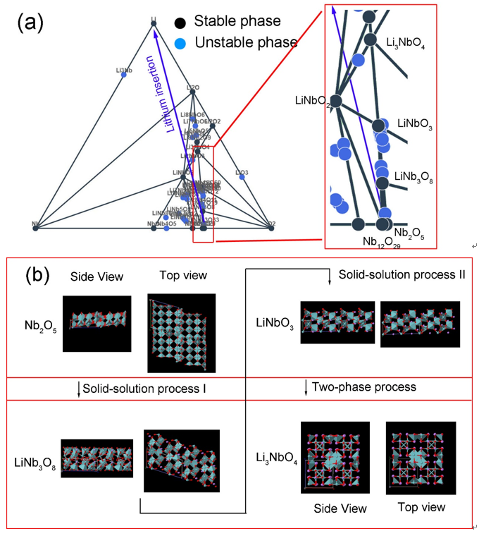 为研究该材料嵌入式赝电容现象的结构机制,进行了过放电试验并辅以原位表征方法,提出了该材料嵌锂过程中,成分的变化过程在相图上途径一系列中间相,不涉及直接相变过程,而具有类似于固溶体的过程。