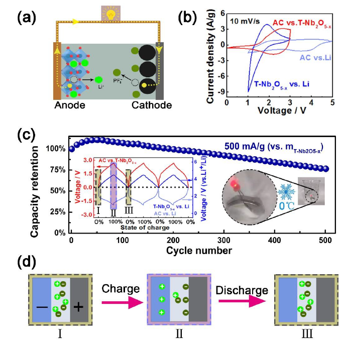 得益于材料本征优异的电化学动力学,组装了活性炭(AC)正极对T-Nb2O5-x负极的扣式锂电容器件,其可以在0 oC条件下点亮红色LED灯,体现了其在恶劣条件下仍可实现快速充放电及高能量密度的性质。
