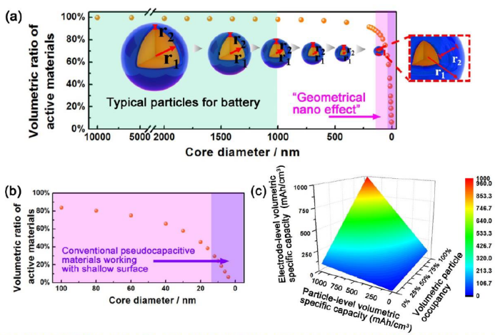 具有高体积能量密度和功率密度的储能器件在工业4.0时代具有愈发重要的作用。赝电容是指在特定材料表面2-3 nm层发生的快速氧化还原现象,可以提供比双电层电容更高的能量密度及比电池更快速的充放电速度。然而,为了暴露活性表面,往往需要引入具有精细纳米结构的第二相作为辅助用以构建活性界面和防止团聚。研究者们用类似的包覆手段用于改性微米级别的电池材料已取得过巨大成功,但对于赝电容材料,由于仅有浅表面具有活性,惰性辅助相的引入将极大的降低活性物质所占的体积比,本文提出“几何纳米效应”(Geometrical nano effect)用于描述这一现象。