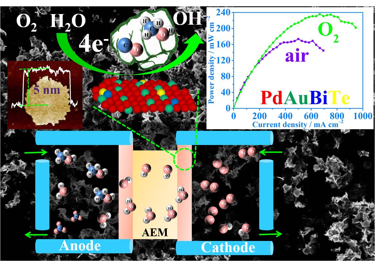 近期,贵州大学化学与化工学院袁强教授课题组(纳米与能源工程创新课题组)和精细化工研究开发中心杨松教授合作,首次开发了一种可见光诱导的模板合成通用策略,克服了不同种类金属物理化学性质差异和晶体生长限制,成功合成了超薄、大尺寸的四元PdAuBiTe纳米片。高分散Au的引入赋予PdAuBiTe纳米片在阴极氧还原反应中拥有高质量活性、高抗一氧化碳中毒性、高抗甲醇干扰性和优异的耐久性。在氧气和空气气氛中,PdAuBiTe纳米片在甲醇燃料电池器件中的峰功率密度分别可达235.7mW cm-2和173.5mW cm-2,是目前文献已报道的最高值。该工作以“Ultrathin PdAuBiTe Nanosheets as High-performance Oxygen Reduction Catalysts for Direct Methanol Fuel Cell Device”为题发表于国际顶级期刊《Advanced Materials》(影响因子:30.849;该期刊在2020年谷歌学术期刊全球排名第六,在化学和材料科学领域排名第一)。第一作者是2020级博士研究生赵凤玲,指导老师为袁强教授和杨松教授。