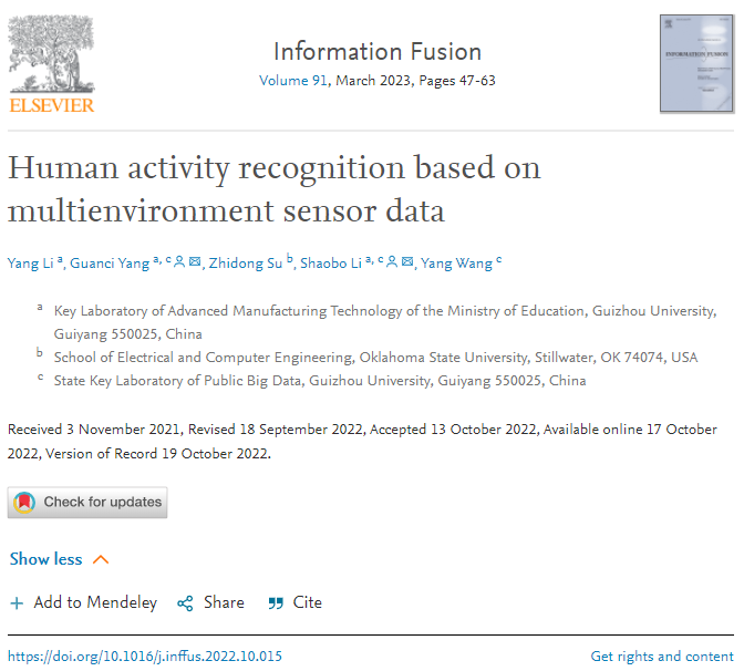 该成果以“Human activity recognition based on multienvironment sensor data”为题发表于一区Top期刊《Information Fusion》(IF =17.564)。贵州大学现代制造技术教育部重点实验室杨观赐教授和省部共建公共大数据国家重点实验室李少波教授为共同通讯作者,2019级博士研究生李杨为第一作者。