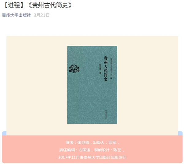 《贵州古代简史》是《现代贵州学术精品丛书》(第二辑)中的一册,是贵州省新闻出版广电局2015年重点图书,获2015年贵州省重点图书出版传媒事业发展专项资金资助。2017年11月由贵州大学出版社出版发行。