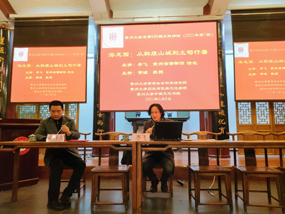 2021年3月8日晚,由贵州大学哲学社会科学研究院主办,贵州大学历史与民族文化学院、贵州大学中国文化书院承办的贵州大学“文科讲坛”总第689期(2021年第7期)特邀贵州省博物馆馆长李飞,为历史与民族文化学院师生带来的了题为“海龙屯:从斡腹山到土司行署”的专题讲座。学院杨军昌院长、刘峰教授、张明教授等上百名师生参加了讲座,学院黄诚教授主持。
