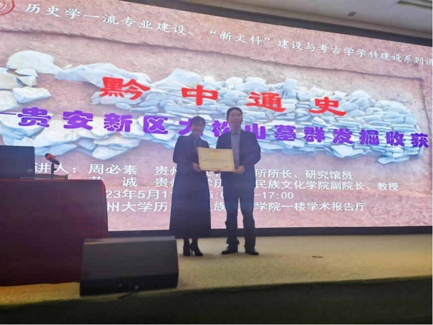 贵州省文物考古所所长、研究馆员周必素应邀莅临我校,为广大师生作了题为“黔中通史——贵安新区大松山墓群发掘收获”的学术讲座。本次活动得到了贵州省文物考古所、学习强国贵州学习平台、中国文物报、多彩贵州网等多家单位的协助和支持。全校二百余名师生到场并参与交流互动,讲座活动由贵州大学历史与民族文化学院副院长黄诚教授主持。