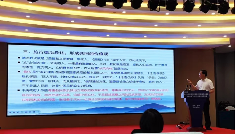 第三位嘉宾是云南省社会主义学院一级巡视员、原云南民族大学文学与新闻传播学院院长、民进云南省委副主委陈友康教授作题为《统一性引领云南各民族汇入中华民族共同体的浩瀚大海》的主旨演讲。