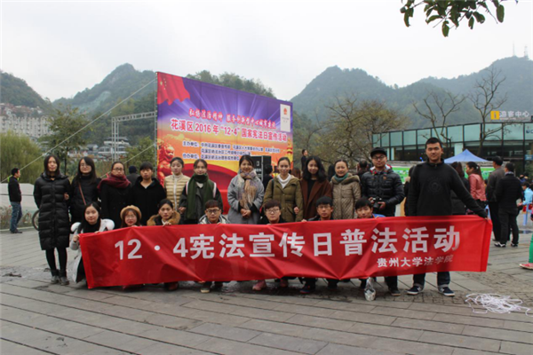 此次活动不仅响应了我党加强法制建设的号召,促进了两校的交流,提高了同学们学习法律知识的热情,活跃了校园的学习氛围,也为服务经济社会的发展营造了良好的法治教育环境。 活动三: 12月2日上午九点半,花溪区2016年“12.4”国家宪法日宣传活动在花溪湿地公园南门举行。我院19名志愿者前往开展普法活动。