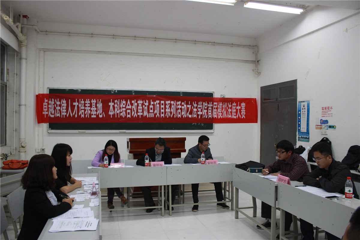 2014年11月4日晚18:30,由卓越法律人才培养教育基地办公室、法学院研究生科、法律硕士教育中心、学工科共同主办,法学院研究生会承办的法学院模拟法庭大赛八分之一决赛第二场在博学楼105举行。大赛组委会特邀请著名律师、法学院教师汪晓谦、法硕中心刘月凤老师和贵阳市中级人民法院刑二庭何渡海法官担任此次比赛的评委,法律硕士教育中心陈松副教授观看本次比赛。本场八分之一决赛共有四支队伍参赛。