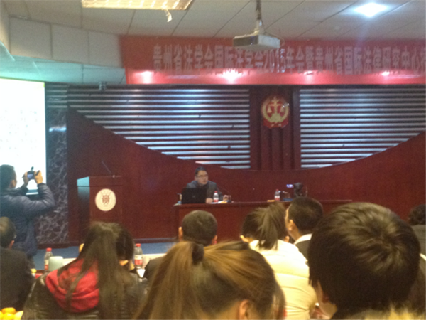 紧接着,国际法学研究会会长赵少群教授首先对国际法学研究会成立一年以来的主要工作进行了年度总结,并对欧洲难民问题进行了探讨。在欧洲难民问题上,赵教授介绍了难民问题的由来,在难民地位上一般给予国民待遇。随后,副会长孙志煜副教授对当前热点中菲南海仲裁案进行了探讨,在介绍中菲南海仲裁案的始末后,就此延伸问题进行了分析。继这个话题之后,常务副会长兼秘书长阮志群副教授紧接着对中美BIT问题进行了分析,并对中美BIT谈判的过程及未来展望提出了个人见解。另外,国际法学研究会副会长唐海清教授针对当前巴黎恐怖展开了国际恐怖主义以及反恐问题的探讨,提出构建以联合国为主导的国际反恐体系、改革引渡制度等。紧接着,副会长毕健副主任指出贵州国际法律服务需要研究,提出应该建立一个贵州省国际法律研究中心。最后,贵达律师事务所戴勤律师对国际法律服务的业务范围进行了介绍。对于各位嘉宾所探讨的议题,各位参会人员纷纷表示了浓厚的兴趣。在最后的自由发言与讨论环节,大家踊跃发表自己的意见,并针对自己感兴趣的话题和嘉宾展开了讨论。最后,本次年会在热烈的气氛中闭幕。