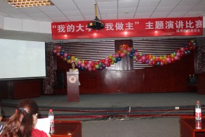 主持人宣布比赛开始,各位参赛同学依次上台展开了十分精彩的演讲。在他们或激昂或压抑的演讲声中,有同学们对大学生活的感受,有切身的反思,还有对自身的期望和对同学们的警醒,使观众很受震撼。一阵阵热烈的掌声送走了一位选手又迎来下一位选手。紧接着是最激动人心的时刻,主持人宣布各位选手的成绩以及获奖名单,并由贺明吓老师,牟启尉同学,林静同学和张伦同学为获奖者颁奖;然后牟启尉同学和林静同学分别对这次比赛做了点评和总结;最后主持人对参与此次活动的师生表示感谢,比赛结束。