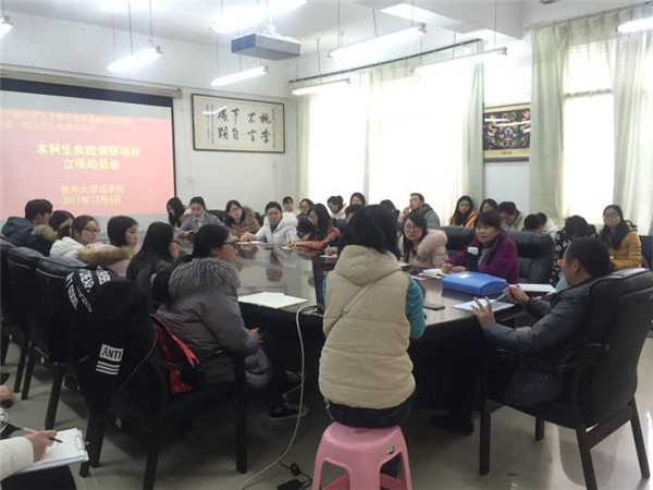 为切实做好国家卓越法律人才教育培养基地建设以及贵州省法学一流专业建设,法学院本科生实践调研项目立项动员会于2017年12月6日在法学院会议室召开,会议由法学院副院长宁立标主持。教学科研科科长陆万莲、杨智婷老师以及欧蓉等36名申请本次实践调研项目的同学参加了本次会议。