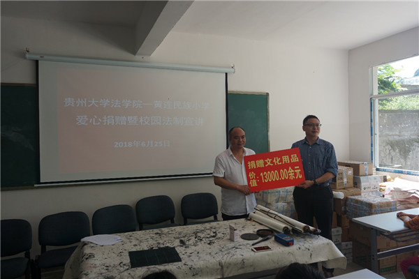 为深入学习贯彻党的十九大精神和习近平总书记系列重要讲话精神,落实习近平总书记提出的党要管党、从严治党要求,全面提升基层党建工作制度化、规范化水平,进一步严肃政治纪律和政治规矩,创新和优化党组织生活方式,激励全体党员在发挥先锋模范作用中永葆先进性、纯洁性,实现“两学一做”常态化机制化,贵州大学法学院机关党支部、教工党支部于2018年6月25日赴乌当区羊昌镇黄连村开展了主题为“不忘初心,牢记使命”的主题党日活动,同时开展了“贵州大学法学院——黄连民族小学爱心捐赠暨校园法制宣讲”活动。