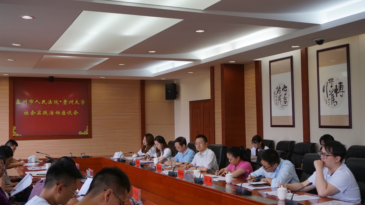 法学院暑期社会实践队由法学院党委副书记洪影秋、法学院副院长张林鸿、国际法教研室主任阮志群老师、法硕中心老师刘杰带队前往。实践队于7月9日早上9点半准时到达盘州市人民法院,并在盘州市人民法院开展针对实践安排以及专题调研的联席会议。