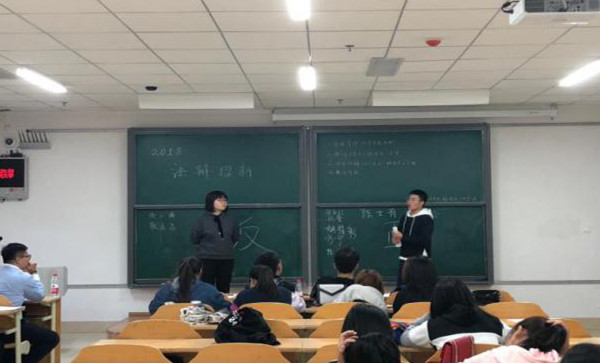招新的最后一个环节是分组对抗赛,经过选拔留下的十五位同学分为四组,抽取了两组辩题,分别进行辩论对抗,10月20日晚7时10分,对抗赛在模拟法庭举行,两组同学就辩题展开了精彩的辩论,他们在场上表现出的临场素质让各位评委刮目相看,在简短的点评之后,评委就各位同学的表现给出了自己的打分。