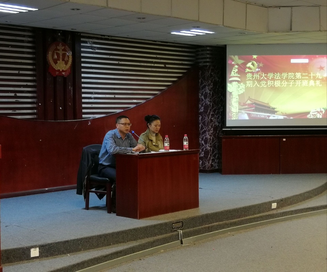 会议伊始,法学院党委书记胡小兵老师首先发表了讲话,他对同学们提出了四点要求:第一要讲政治,要求所有同学要有高度的政治自觉,在思想上和行为上与党保持高度一致。第二要有纪律,要求同学们要讲规矩,对党的纪律和制度持有敬畏之心,并不断加强学习,提高自己能力。第三,要讲学习,要求同学们养成与时俱进的学习习惯。第四要讲风格,要求同学们有责任和担当,有我为人人的奉献精神。胡书记要求同学们从学习上、思想上、政治上等各方面提高自己,争取早日入党。