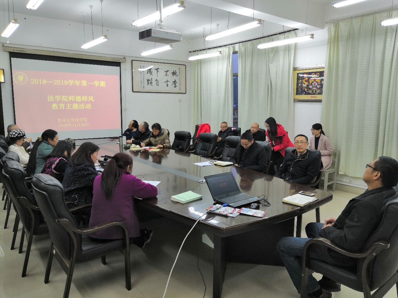 为加强我院新时代师德师风建设,重视新时代教学质量的提高。2018年11月20日,法学院党委书记胡小兵老师,副院长宁立标教授、各教研室主任以及部分教师代表出席了师德师风教育主题活动。