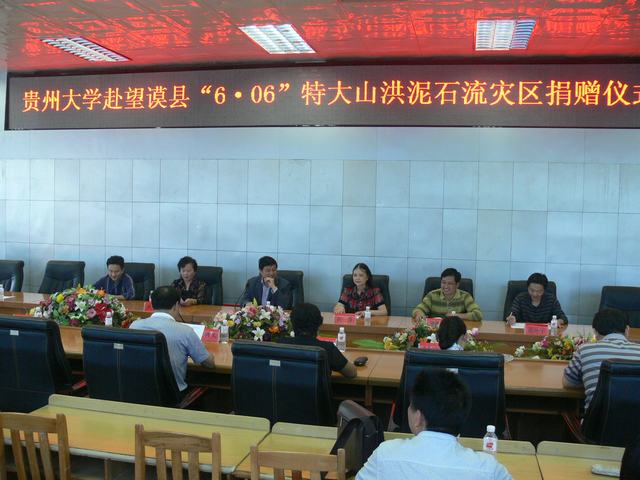 今年6月6日,望谟县发生特大山洪泥石流,泥石流量是甘肃舟曲的6倍,人民生命财产受到严重损失。灾害发生后,我校党委、行政高度重视,全校教职工心系灾民。校党委书记姚小泉、校长陈叔平带头捐款,离退休处、继续教育学院等单位捐物。