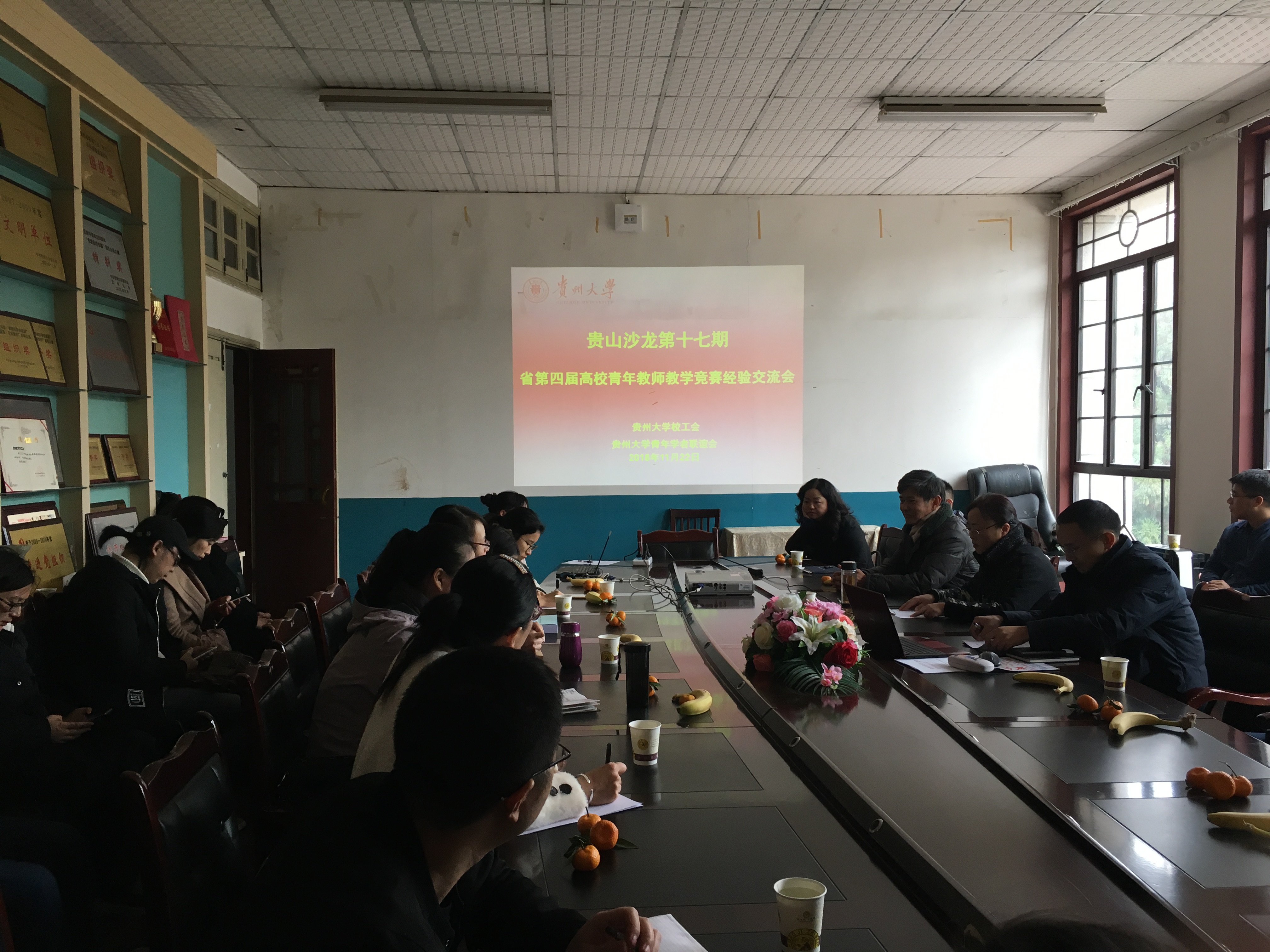 2018年11月22日下午,贵州大学工会第十七期“贵山沙龙”在校工会二楼会议室举行,本次沙龙主题:“贵州省第四届高校青年教师教学竞赛”参赛获奖教师与青年教师交流竞赛经验。本次活动的开展旨在鼓舞和带动青年教师的参赛热情,促进青年教师教学水平的提高。校教师工作处处长史勤先、教务处副处长黎应飞及各学院青年教师20余人参加了交流会。会议由校工会常务副主席候玲娅主持。