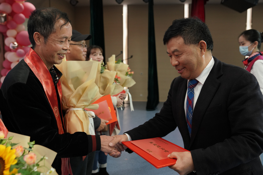荣退仪式上,王慧、黄开斌、宋宝安、骆长江、令狐彩桃为荣退教师颁发荣退证书。学生代表向荣退教师敬献鲜花,感谢师恩。