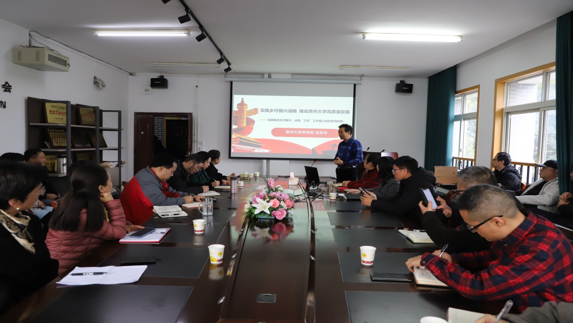 11月24日上午10:00,校工会党支部联合研究生院党委研究生工作部联合党支部、离退休党委在职党支部在东校区3号行政楼303会议室共同开展党史学习教育暨“牢记殷切嘱托、忠诚干净担当、喜迎建党百年”专题教育集中学习,以“学先进、强贵大——劳模上讲堂”为党日活动主题,邀请全国先进工作者龙友华教授做“实事乡村振兴战略 推动贵州大学高质量发展”的主题宣讲,宣讲会由工会常务副主席方韧主持。