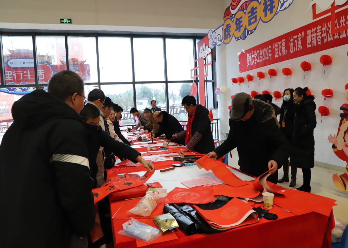 1月10日,在西校区体育馆二楼校工会组织开展迎新春书法公益送福送春联活动,并与财务处、离退休处联合举办了年货节。校工会特邀我校4位书法协会退休老教师到现场为教职工写福送春联。校党委副书记骆长江、令狐彩桃、副校长李军旗来到活动现场,为现场的教职工送上新年祝福。