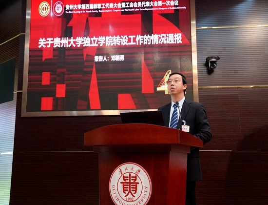 贵州大学党委常委、副校长邓朝勇从教育部相关文件精神、省教育厅相关文件和会议精神、学校推进独立学院转设情况等三个方面作关于《贵州大学独立学院转设工作的情况通报》。