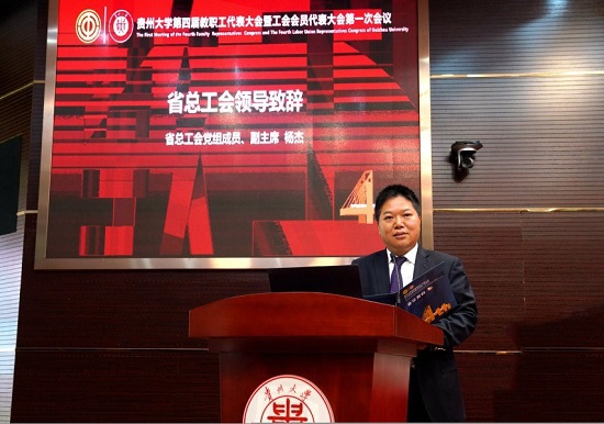 杨杰致辞。他说,近年来,贵州大学工会在校党委和省教育工会的领导下,牢固树立用心服务教职工理念,紧紧围绕学校中心工作,充分发挥工会密切联系职工优势,在凝聚教职工力量、参与学校民主管理、服务会员、加强自身建设等方面做了大量工作,成效显著。他代表省总工会对一直以来高度重视关心支持学校工会工作的贵州大学党委、行政表示衷心感谢,并就校工会的工作提几点希望:把“讲政治”作为第一位前提;把“抓学习”作为第一位要求;把“围绕中心”作为第一位使命;把“服务职工”作为第一位职责;把“改革创新”作为第一位目标;把弘扬劳模精神、劳动精神、工匠精神“三种精神”作为第一位要务。