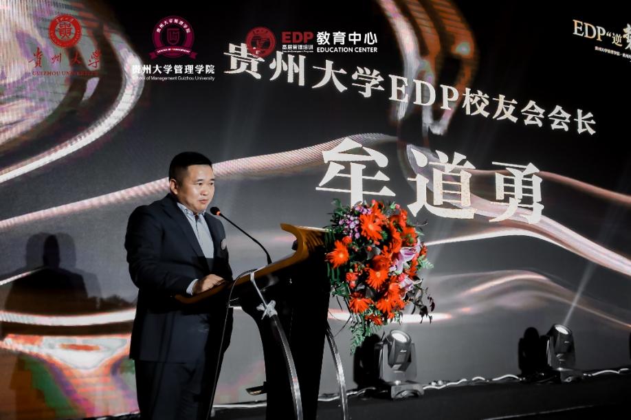 贵州大学EDP校友会会长牟道勇在发言中,代表EDP校友会对各位领导、嘉宾和各班同学代表的莅临表示衷心的感谢,也对全年的工作进程进行了工作总结。好风凭借力,扬帆正当时,作为EDP校友会会长,今后的每个工作,都将会乘风破浪,以高标准、高质量、高要求要做好组织建设;作为EDP九班的班长,结业正当时,未来,我们将信心满满走向新征程。