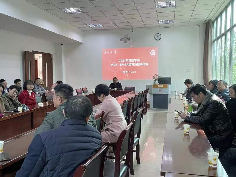 2021年12月22日中午,贵州大学管理学院MBA教育中心在慎思楼201教室举行“2021年管理学院MBA、EMBA教育质量研讨会”。管理学院副院长周莉莉教授、MBA中心主任项凯标教授、EMBA中心主任李雨峰副教授,MBA中心任课老师、论文指导老师以及中心工作人员共40余位人参加了此次研讨会。研讨会由MBA中心副主任何跃勇老师主持。