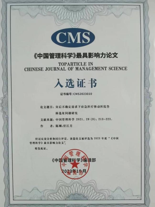 近日,第二十五届中国管理科学学术年会暨优选法统筹法与经济数学研究会2023年年会在武汉华中科技大学举行。我院陈刚、付江月两位副教授发表于《中国管理科学》2021年第9期的文章《灾后不确定需求下应急医疗移动医院鲁棒选址问题研究》获评2023年度《中国管理科学》最具影响力论文,全国共30篇论文获此殊荣。