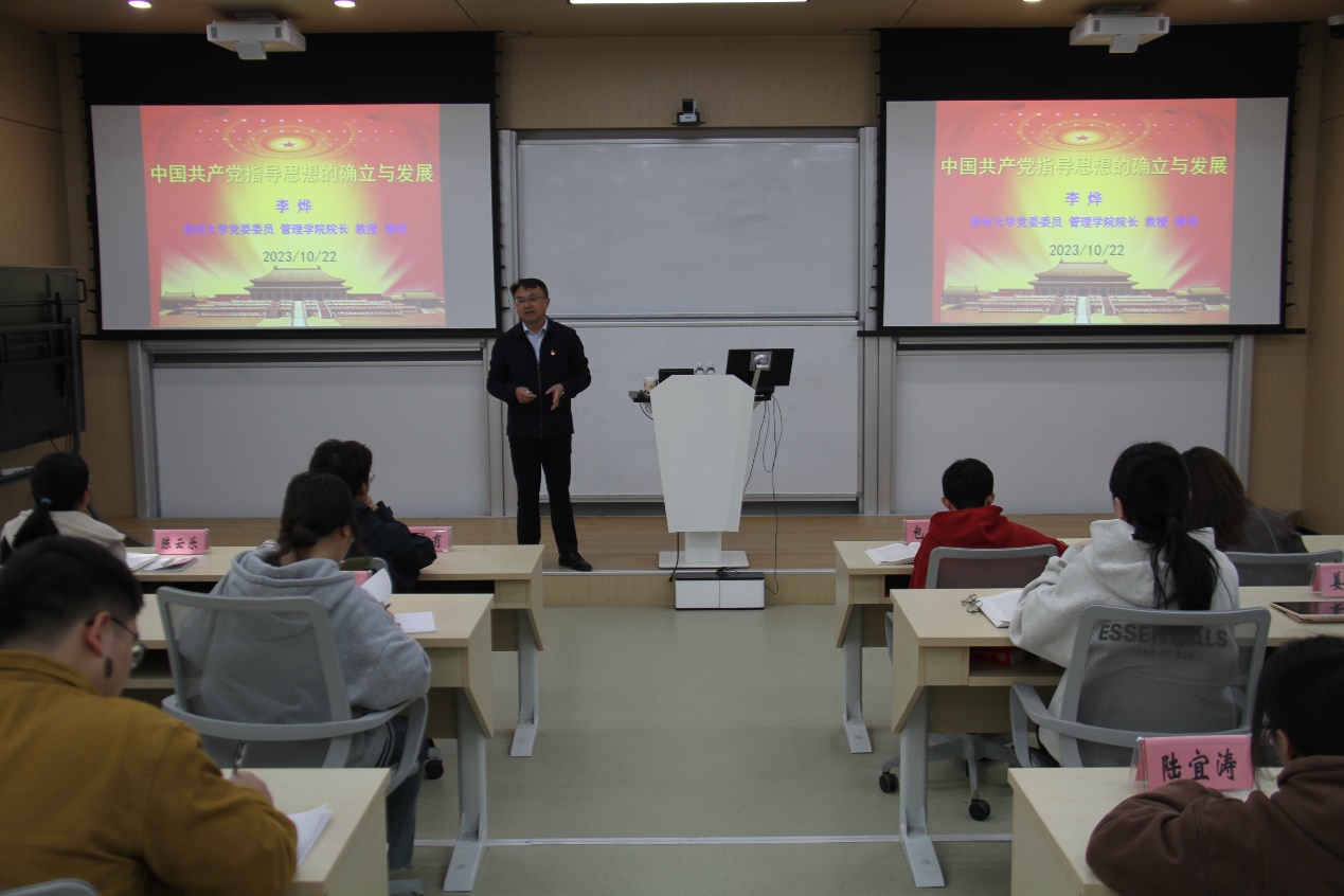2023年10月22日上午,贵州大学管理学院第三十九期入党积极分子培训班专题党课在致远楼102教室顺利开展。本次课程由贵州大学党委委员、管理学院党委副书记、院长李烨同志担任主讲人,主要内容围绕“中国共产党指导思想的确立与发展”展开。