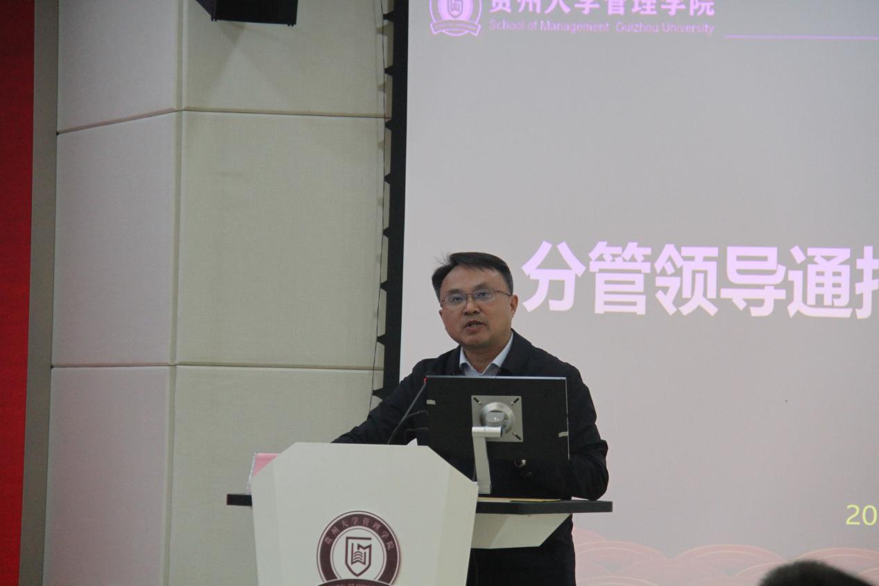 大会第二阶段,贵州大学副校长漆思教授走进管理学院思政课堂,为学院120余名师生讲授题为“共产党人‘心学’:文化传承与创新——不确定性世界变局中的悟性智慧”的思政课。校党委正处级组织员、院党委副书记(主持党委工作)周莉莉主持。