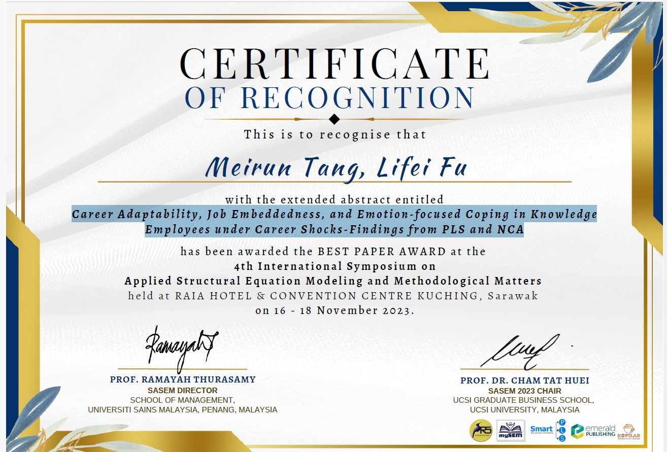 此次研讨会还邀请了Emerald出版社组织的编辑,讨论了如何在高水平期刊上发表论文;同时,来自全球各国的教授、学者和博士生们也纷纷汇报了自己近期的研究成果。可喜的是,汤美润老师及其研究生付礼菲(2022级工商管理专业)合作的论文“Career Adaptability, Job Embeddedness, and Emotion-focused Coping in Knowledge Employees under Career Shocks—Findings from PLS and NCA”深受评委会青睐,赢得了最佳论文奖项。此次成就标志着贵州大学管理学院在国际学术界的影响力进一步提升,同时也为研究生培养提供了国际化的视野和实践平台。