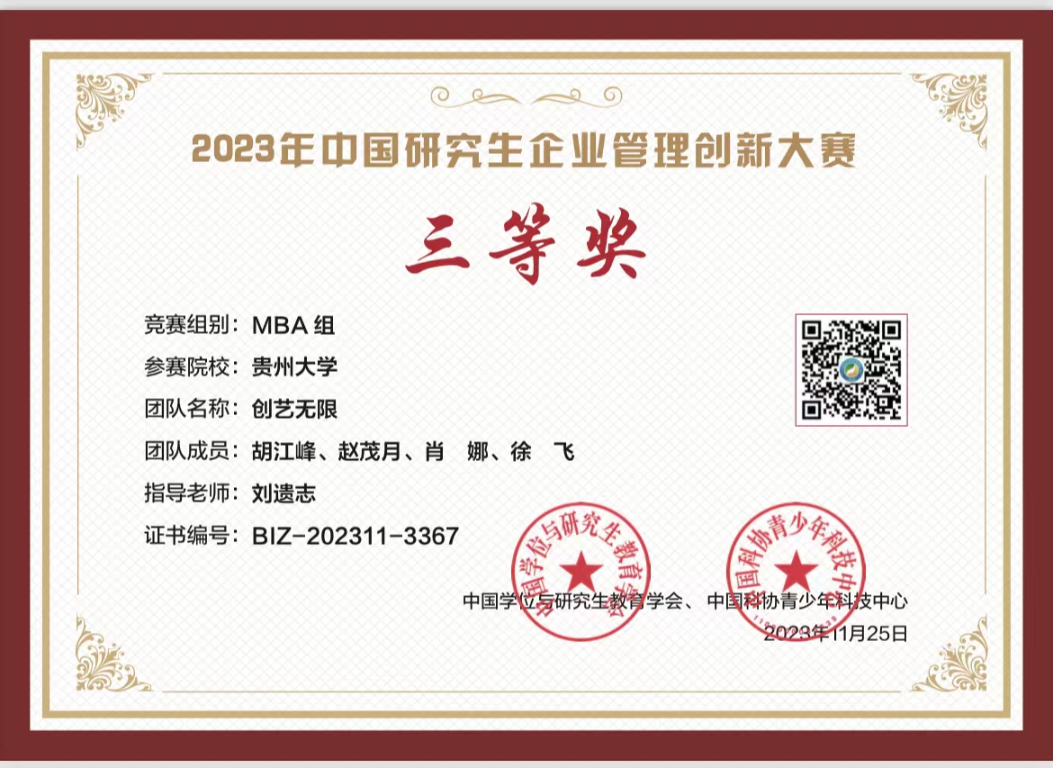 我校管理学院党委副书记邓琳带队,管理学院研究生队和MBA研究生队赴上海大学参加决赛,由管理学院潇潇副教授指导的“街尔华”队最终荣获MBA组全国一等奖贵州大学获得优秀组织奖