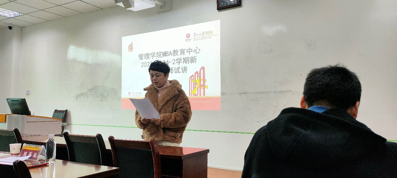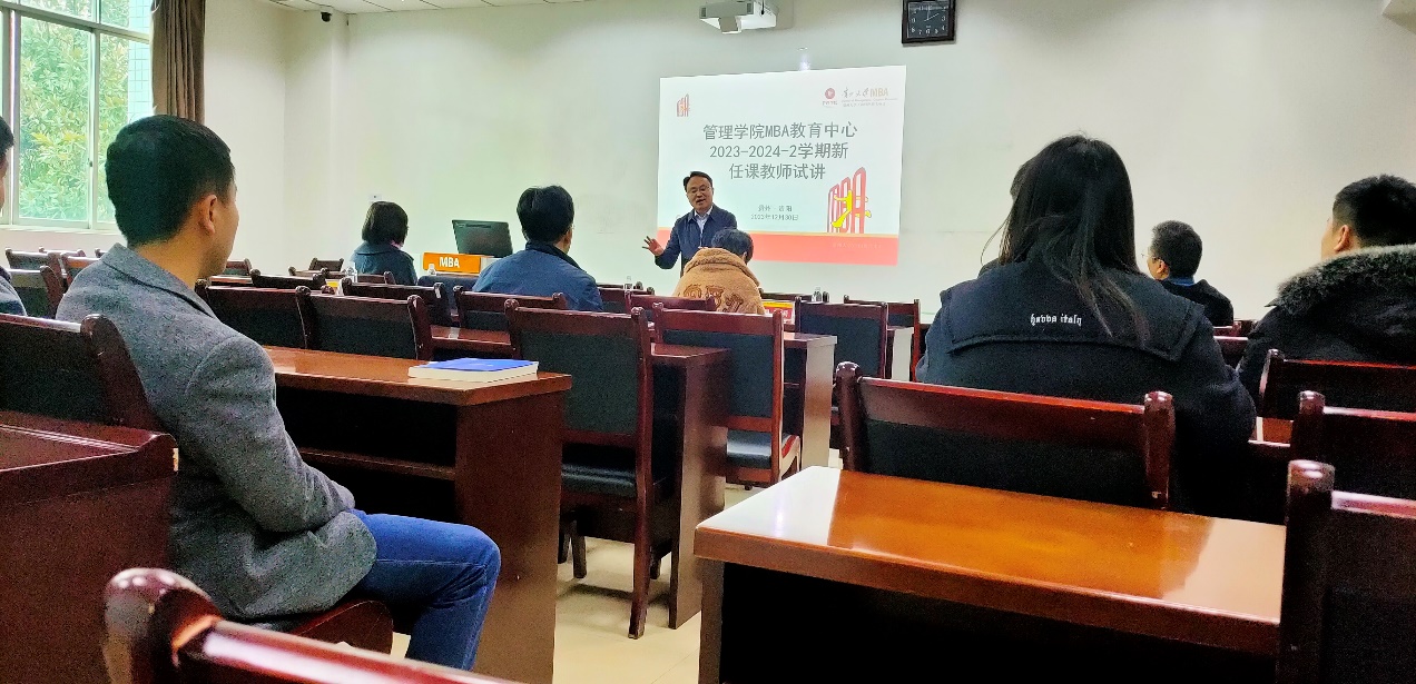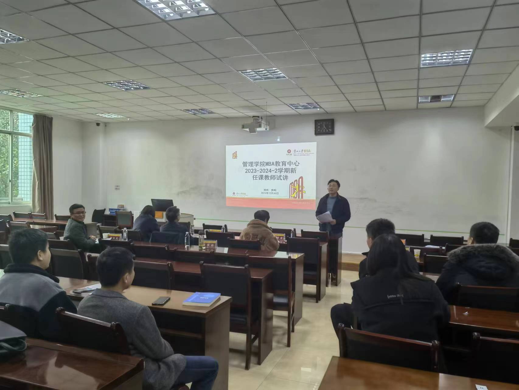 2023年12月30日,贵州大学管理学院MBA教育中心在慎思楼204教室开展2024年春季教师新开课试讲活动。试讲工作由管理学院MBA教育中心副主任何跃勇主持。贵州大学管理学院院长李烨教授,管理学院党委副书记(主持党委工作)周莉莉教授,管理学院副院长(正处级)李本光教授,贵州大学人民武装学院副院长、管理学院副院长(正处级)王婷教授,管理学院林岚涛教授担任评委。