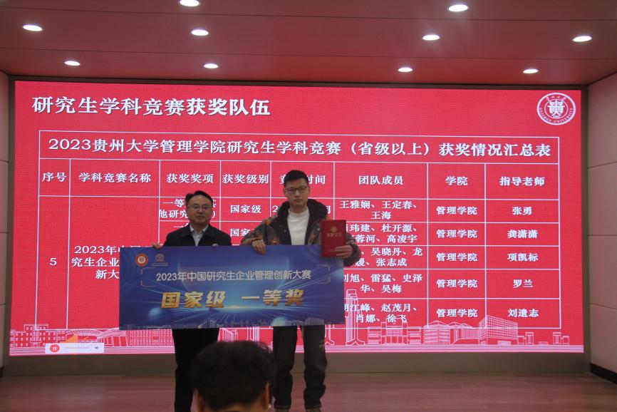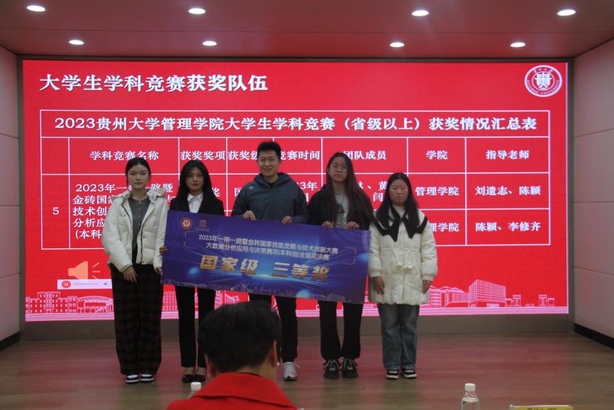 2024年 1月2日中午,贵州大学管理学院学科竞赛总结表彰大会在管理学院三楼报告厅隆重举行,管理学院党委行政班子领导、各专业系主任及科室(中心)负责人、学院近三年新进以及博士老师教师生老师和受表彰学生代表等共同参加出席此次大会。